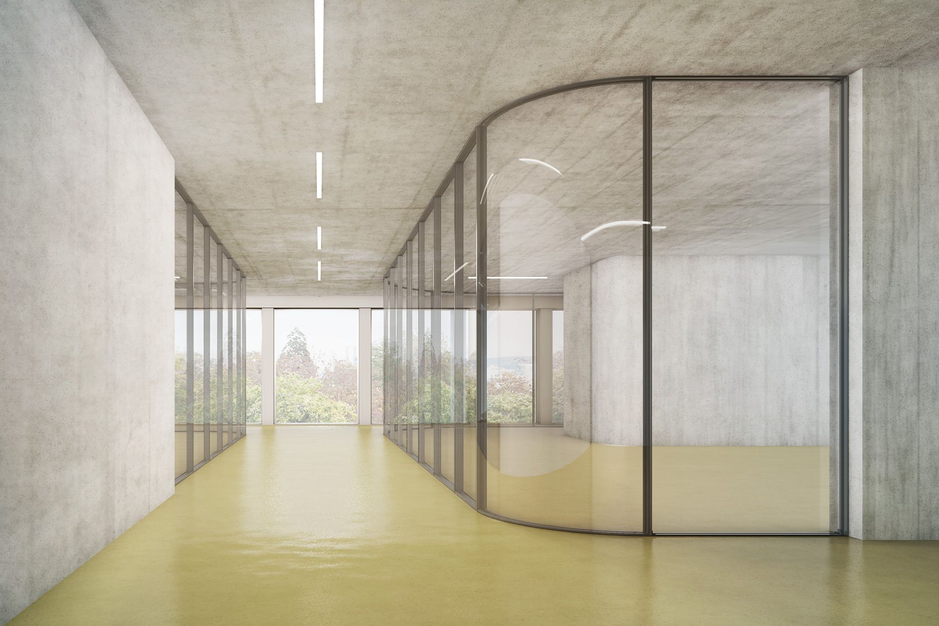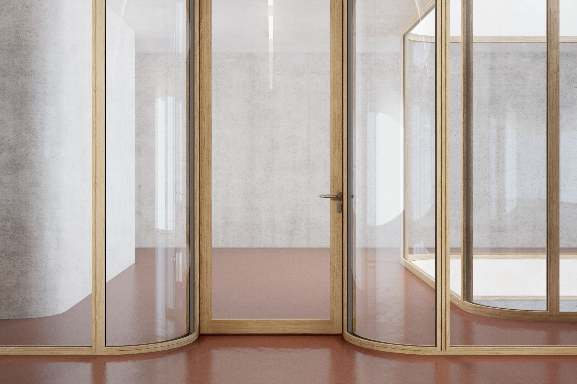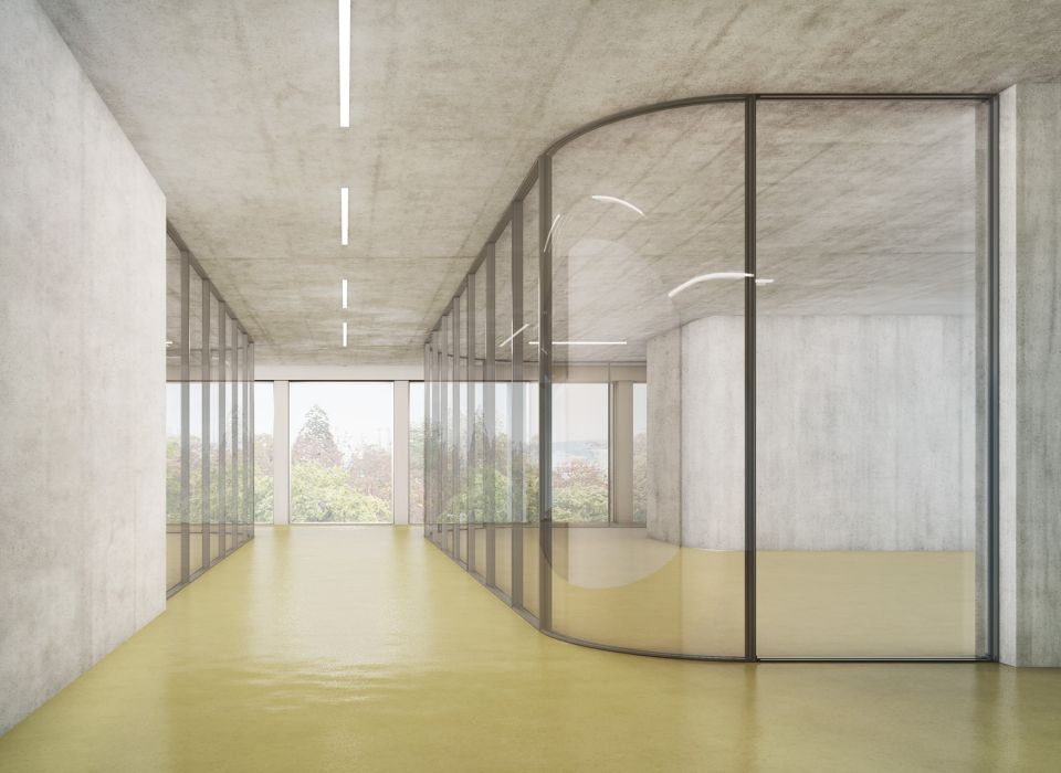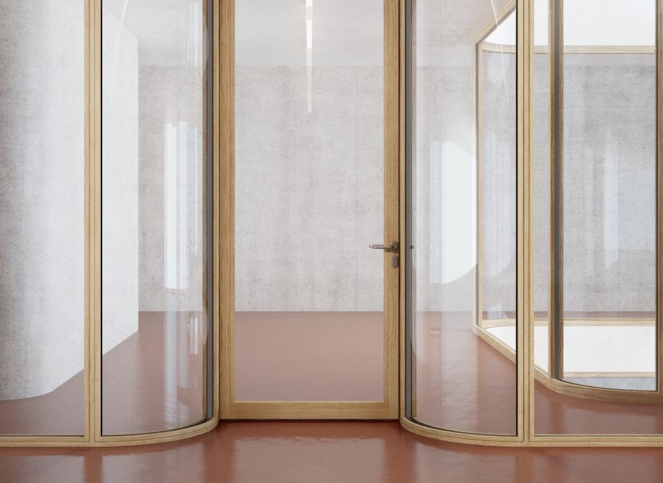 Um die gewünschte Ästhetik mit allen nötigen Funktionen für den Arbeitsbereich zu vereinen, wurde unser gebogenes Brandschutzglas inklusive Schallschutz in einen hochwertigen Eichenholzrahmen integriert. Für das gebogene Glas im Rahmen als auch für das rahmenlose gebogene Glas haben wir im Vorfeld intensive Brandschutztests durchgeführt, um einen absoluten Schutz sicherzustellen. Somit haben wir in Zusammenarbeit mit der Jegen AG den gesamten Prozess von der Entwicklung, über die Produktion bis hin zur Umsetzung bzw. dem Einbau der Gläser begleitet.